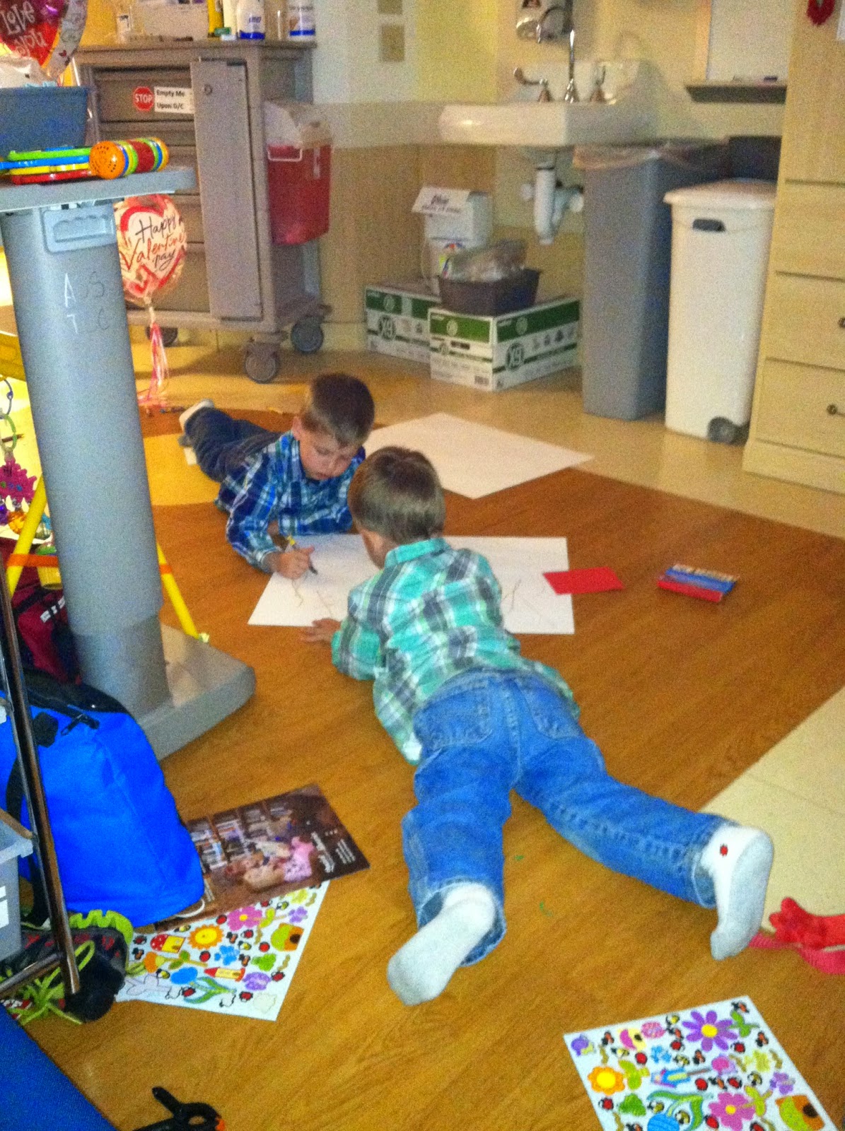 The boys were coloring pictures for Ellie. Then covered everyone in stickers.